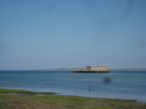 Junto à fortaleza de São Sebastião avista-se lá ao largo a ilha de Goa, com seu farol e uma boa praia de areia branca. E é lançando mão de todo um conjunto de motivos e circunstâncias que envolvem um espaço que Portugal tornou conhecido e construiu obra digna do apreço universal que me despeço e atrevo a fazer uma breve descrição à volta desta ilha que Vasco da Gama descobriu e Camões cantou, para eu agora visitar. Pese o mais que adiante não passar de mera retórica e pouco mais do que roubar tempo aos leitores, pois muitos mestres com saber e arte já se anteciparam no historiar da ilha que em 1899 Mouzinho da Silveira realçava: " A baia de Mussuril, com a Ilha de Moçambique, que lhe serve de quebra-mar e as pequenas ilhas de Goa e Sena para facilitar as conhecenças, é um dos melhores portos de toda a costa e está bem farolada e balizada". A propósito destas duas ilhotas uma transcrição de 1600 que consta na Revista Militar, de 23 de Fev, pp, reza: " Se quiseres entrar em Moçambique (Ilha) deixa as ilhas de São Jorge (Goa) e Santiago (Sena) da banda de sudoeste e alarga-te de São Jorge à vista, irás por 6 braças e 7 , e vai de ló, de maneira que vás com a proa da nau em um areal que está de Nossa Senhora do Baluarte para o sudoeste".