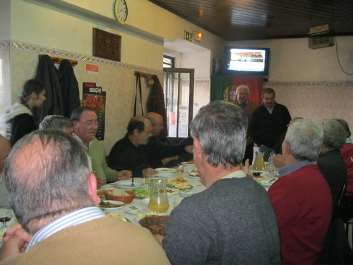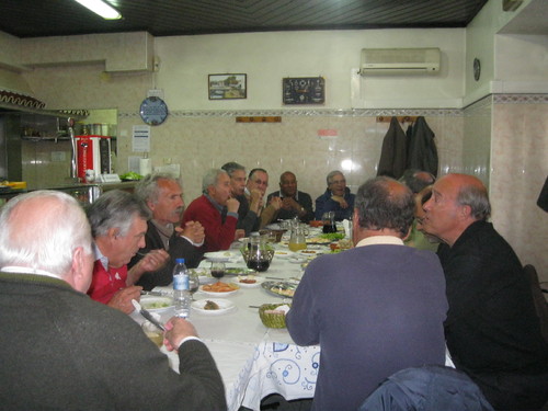 Ladeado pelo "bigodes" e o Jaime, de pulôver vermelho escuro, ficou o Jaucop, o ilusionista que todos conheceram e não se vê na foto, dado que se retirou da mesa, agora armado em fotografo e repórter. Aquele Jaime da Rua do Embaixador que desde Julho de 1968 nunca mais vi, e por isso fiquei espantado por passados 44 anos ainda se lembrar do meu nome completo. O mesmo se deu com outro fugitivo dos contactos, o amigo Nabeiro, que também depois da década 60 lhe perdi o rasto. Aqui o temos à direita da mesa de jaqueta escura e cabeleira entre as orelhas e a careca, como sinal de que os anos são uma mais valia, mas também um contratempo. Foi com muita alegria e emoção que revi estas velhas amizades.