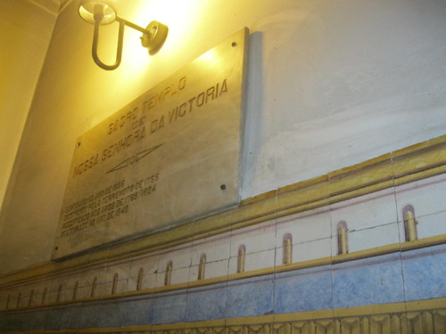 Como a seu tempo comentei, hoje repito: "Quem sai a porta da estação do Metro (Baixa Chiado - Lisboa) que dá acesso à Rua do Crucifixo encontra-se de fronte com a Rua da Vitória. É no primeiro quarteirão desta rua, entre a do Crucifixo e a Rua Aurea (Rua do Ouro) que fica o Sacro Templo de Nossa Senhora da Victória cuja edificação remonta ao ano de 1556. Destruído pelo terramoto de 1755, foi a seguir reedificado em 1765/ 1824, sendo depois restaurado em 1940, como consta gravado em placa de mármore numa das paredes interiores do templo. Incorporada num bloco de imóveis de habitação e comércio, característico da baixa pombalina, a igreja de Nossa Senhora da Vitória é um templo de pequena dimensão, mas muito rico em trabalhos de índole arquitectónico, escultórico e pictórico, que creio tais valores patrimoniais não estão a ser devidamente acautelados por quem de direito; como bem o comprova, no tecto e nas paredes do lado esquerdo, o descarnar da caliça, fruto da infiltração das chuvas ou água das velhas canalizações. Não sei a quem compete o zelo e protecção do sagrado recheio e do imóvel, mas seja a quem for ele é digno de ser integralmente preservado porque assim o reclamam a sua importância histórica e os devotos de NS da Vitória. E são muitos os que diariamente por ali passam e rezam... pelos que não rezam".