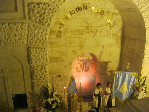 ..... outra, que deixa ver parte do Santuário, do Largo da Luz e do Colégio Militar. Do santuário, já se sabe que teve origem na segunda metade do séc. XV, graças a uma forte devoção e romaria a Nossa Senhora da Luz que teve ali a sua primitiva ermida, faz agora 550 anos, e que depois, por iniciativa da infanta D. Maria, filha de D. Manuel, mandou construir um novo templo, mais amplo, sob a mesma invocação, entre 1575 e 1596.