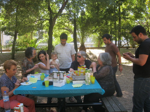 Data festiva, e festivamente celebrada, sobretudo porque calhou ao domingo, e porque culminou com um lanche servido no Parque de Merendas da Quinta das Conchas, no Lumiar. Uma parente próxima, a avó materna, a mãe da criança, a criança, o pai, um tio avô paterno, dois tios paternos e a avó paterna formaram a equipa, e este belo quadro para a posterioridade. Os avôs materno e paterno ficaram de fora porque andavam feitos reportes fotográficos.
