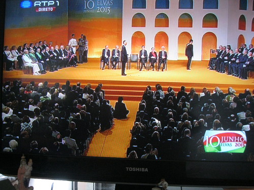 Hoje comemorou-se na cidade de Elvas o Dia de Portugal, de Camões e das Comunidades, tudo de uma assentada para não gastar muito tempo, que neste país está caro. Do pouco que vi e ouvi na televisão gostei muito, sobretudo do discurso do Sr. Presidente da Republica que há muito não via falar de modo tão explicito e frontal aos portugueses a respeito do estado e saúde da nação.