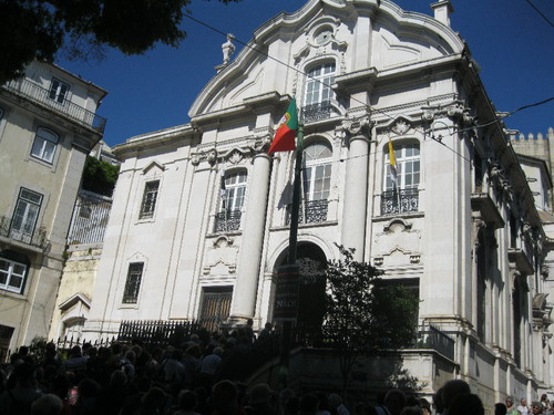 Atrás a banda dos Sapadores Bombeiros e muito povo, muito povo mesmo.