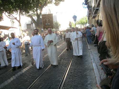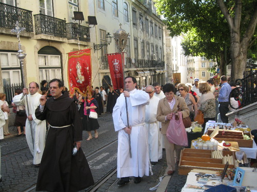 Lá voltei um ano mais, desta vez para pedir ao Santo milagreiro que interceda junto de Nossa Senhora do Viso, para que dê juizinho a uns tantos politiqueiros que se apoderaram de São Bento... e deixem de exigir aos santos que também tenham de pagar a crise..., com dias de trabalho. Entretanto vamos de fugida até à procissão: aqui com o Padre Frei Jorge Marques, guardião e reitor da Casa-igreja de Santo António à Sé, no comando do cortejo.